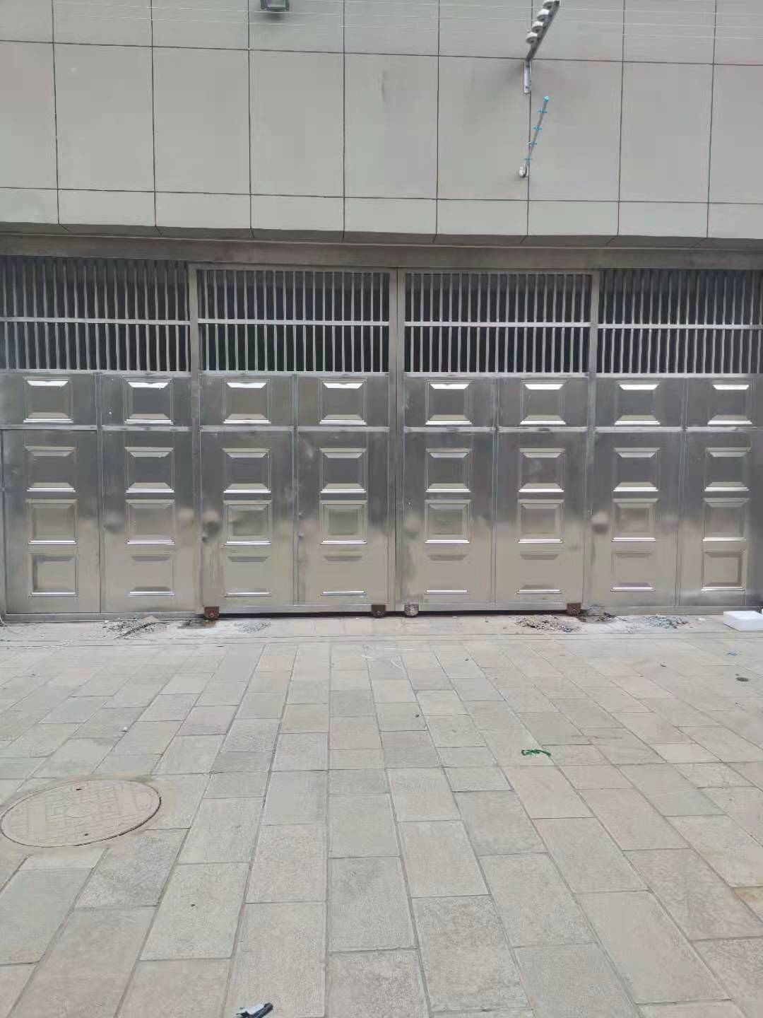 門扇厚度為100 mm,大門所用材料為SUS304不銹鋼。外框采用100×100×3mm方管,內骨架尺寸800×800mm,采用,100×50×2mm方管,雙面封1.5mm厚不銹鋼磨沙板,中間聚氨酯發泡,外框內框和封板均采用焊接和柳接工作工藝制作,表面打磨光滑,下軌道采用12kg鋼軌道,上導道采用120#防傾倒槽鋼,導向輪采用¢100軸承。整個門體采用下承重方式,齒輪齒條傳動。門體上端1.4米處采用相同材料進行封閉。門安好后門體抗沖擊強度可抵御風速大于117kn/h的颶風。
